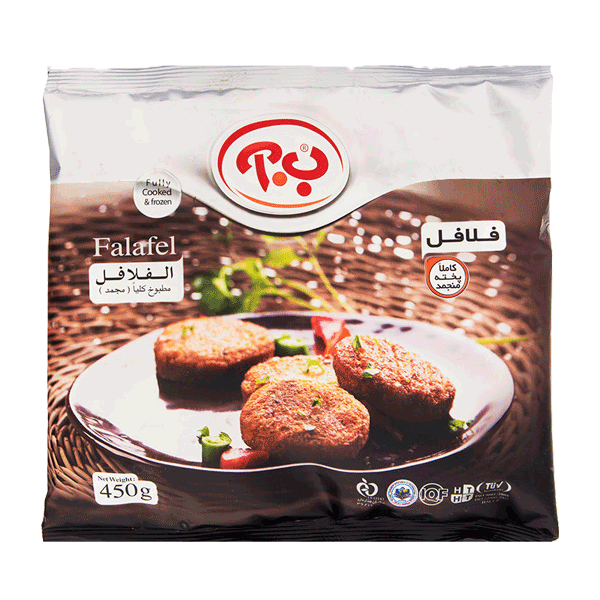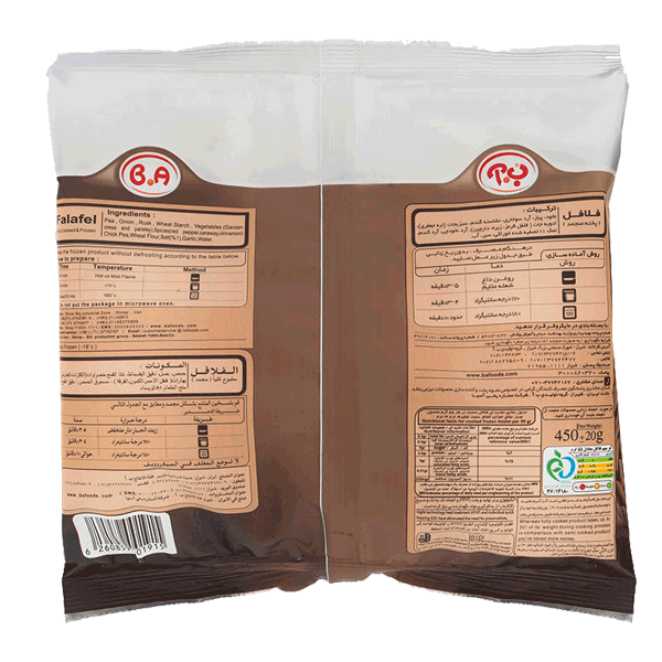 فلافل ب.آ 450 گرم آماده به طبخ با استفاده راحت و آسان برای وعده های غذایی شما می باشد. این محصول دارای ترکیبات نخود، آرد سوخاری، نمک، سبزیجات، پیاز، نشاسته گندم می باشد. ارزش غذایی هر یک عدد فلافل 55 گرم عبارت است با انرژی 127/7 کیلو کالری، چربی 8/5 گرم، نمک 0/55 گرم، اسیدهای چرب ترانس 0/01 گرم می باشد.